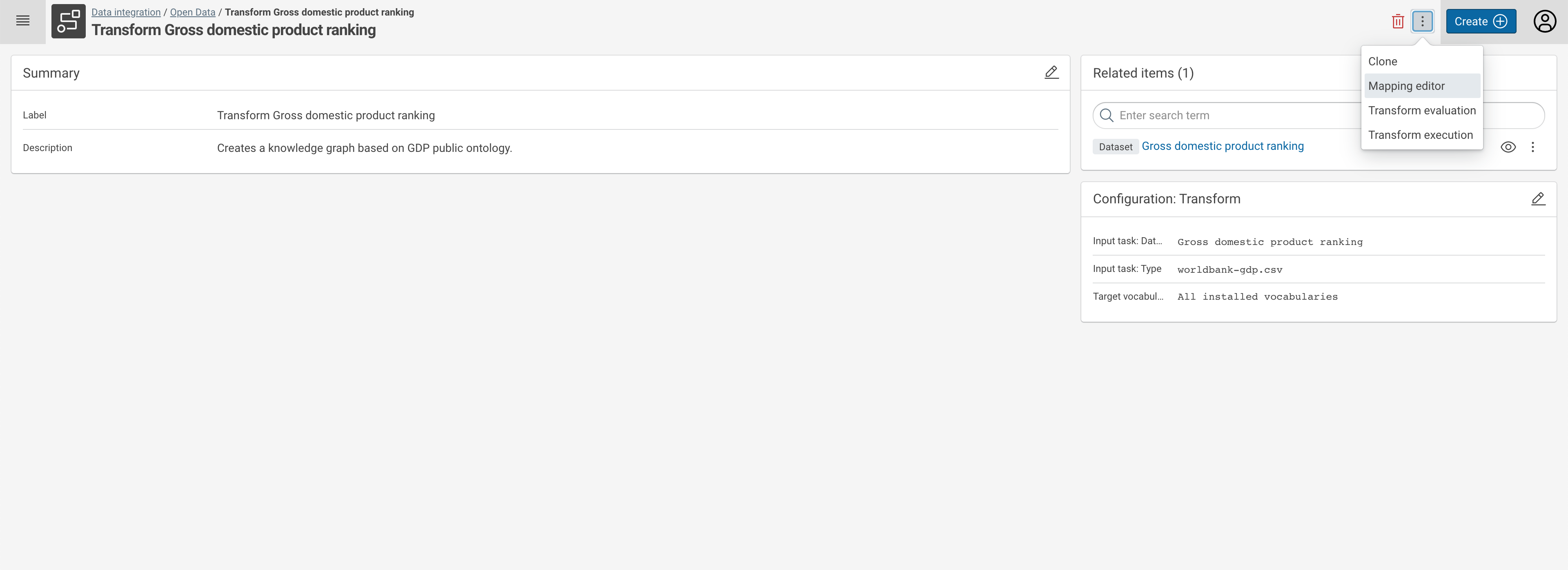 The purpose of transform tasks is to transform datasets (e.g., from one format or schema to another). More specifically, Transform Tasks create Knowledge Graphs out of raw data sources.