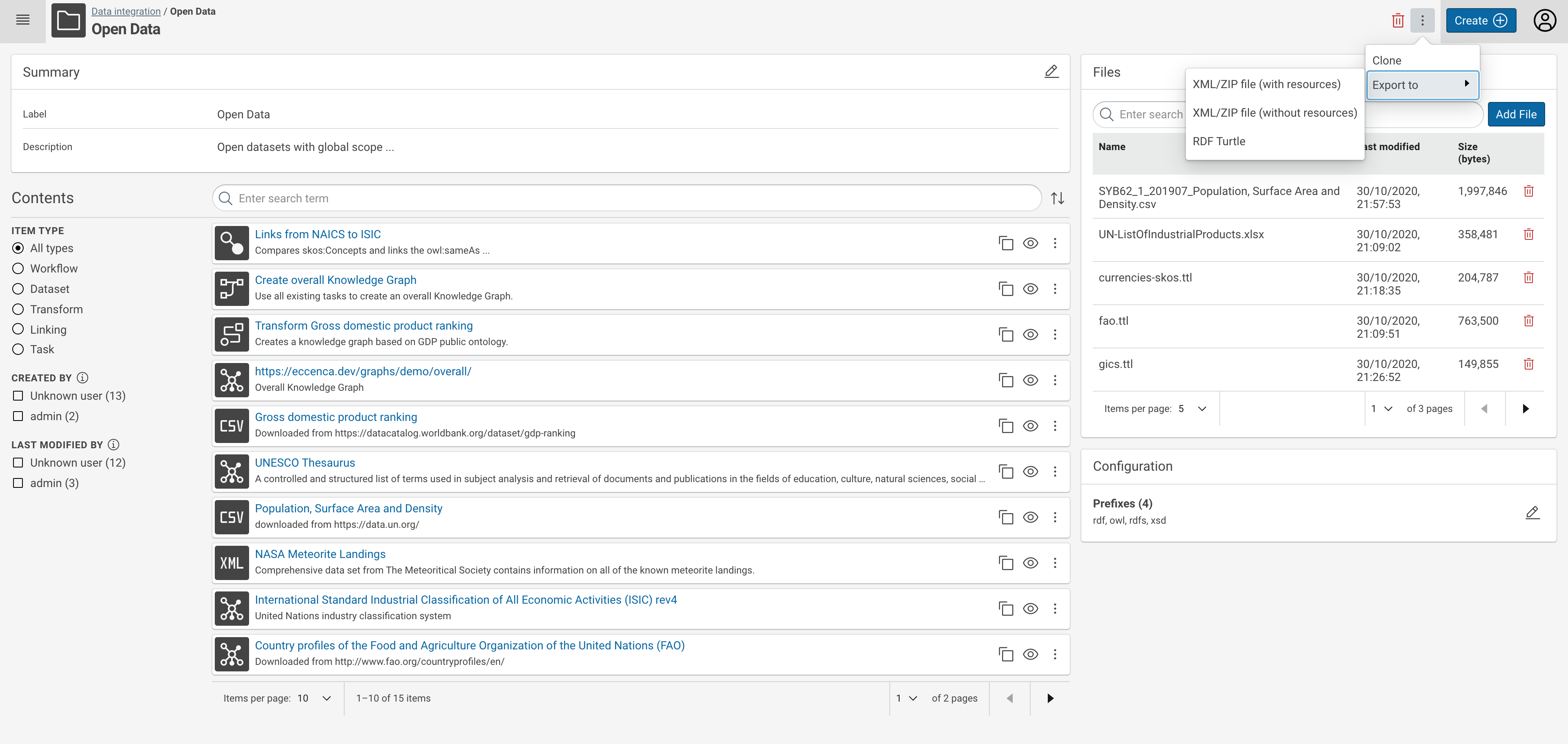 Resources, datasets, tasks and other parts of a project can be added and configured from within the workspace. By clicking the Show Details button on any item in a project, you can ‘look inside’ and define the actual transformation or linking rules, or assemble the actual workflow.
