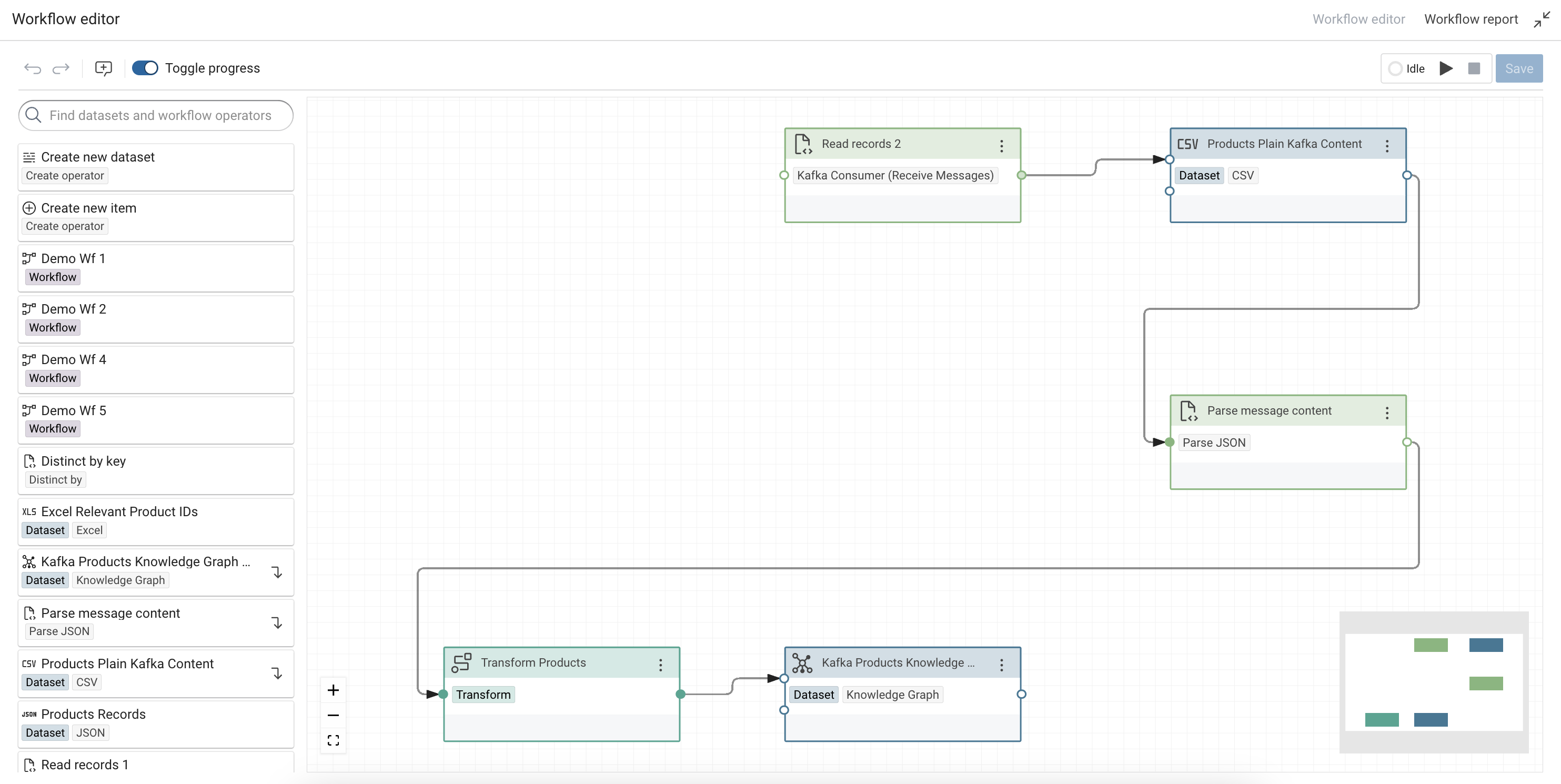To execute the Kafka Consumer it needs to be placed inside a Workflow. The messages will be written to the dataset, which can then be used as a source for further processing.