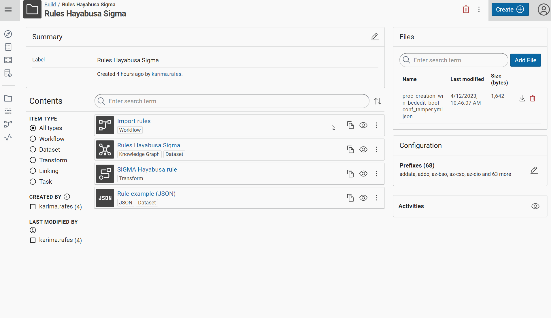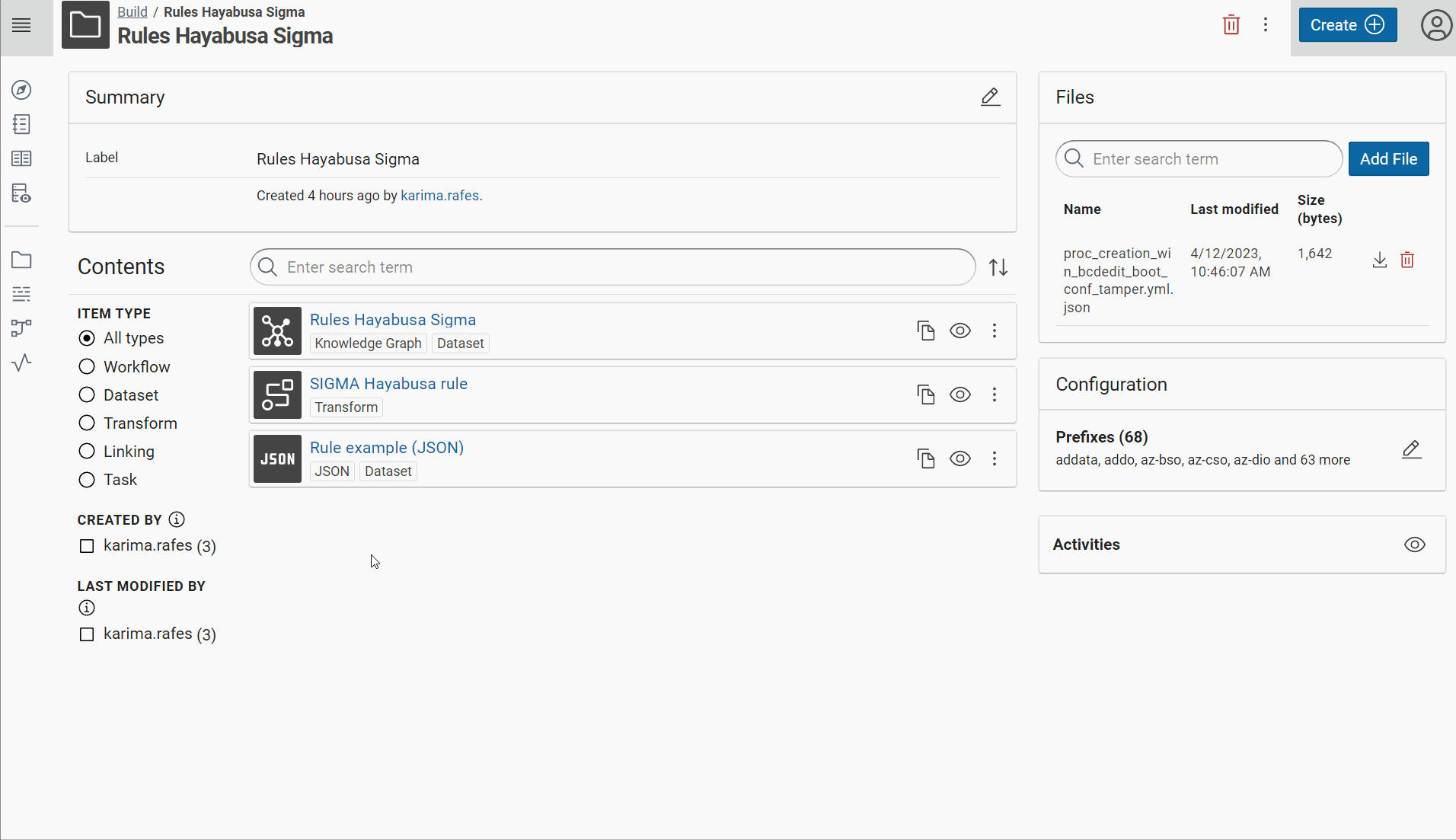 In this project, create a RDF dataset “Rules Hayabusa Sigma” in Corporate Memory for all rules with the named graph: