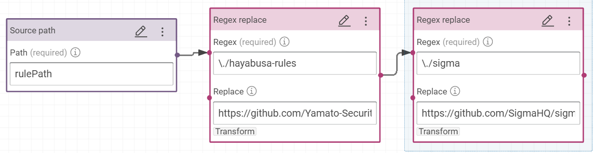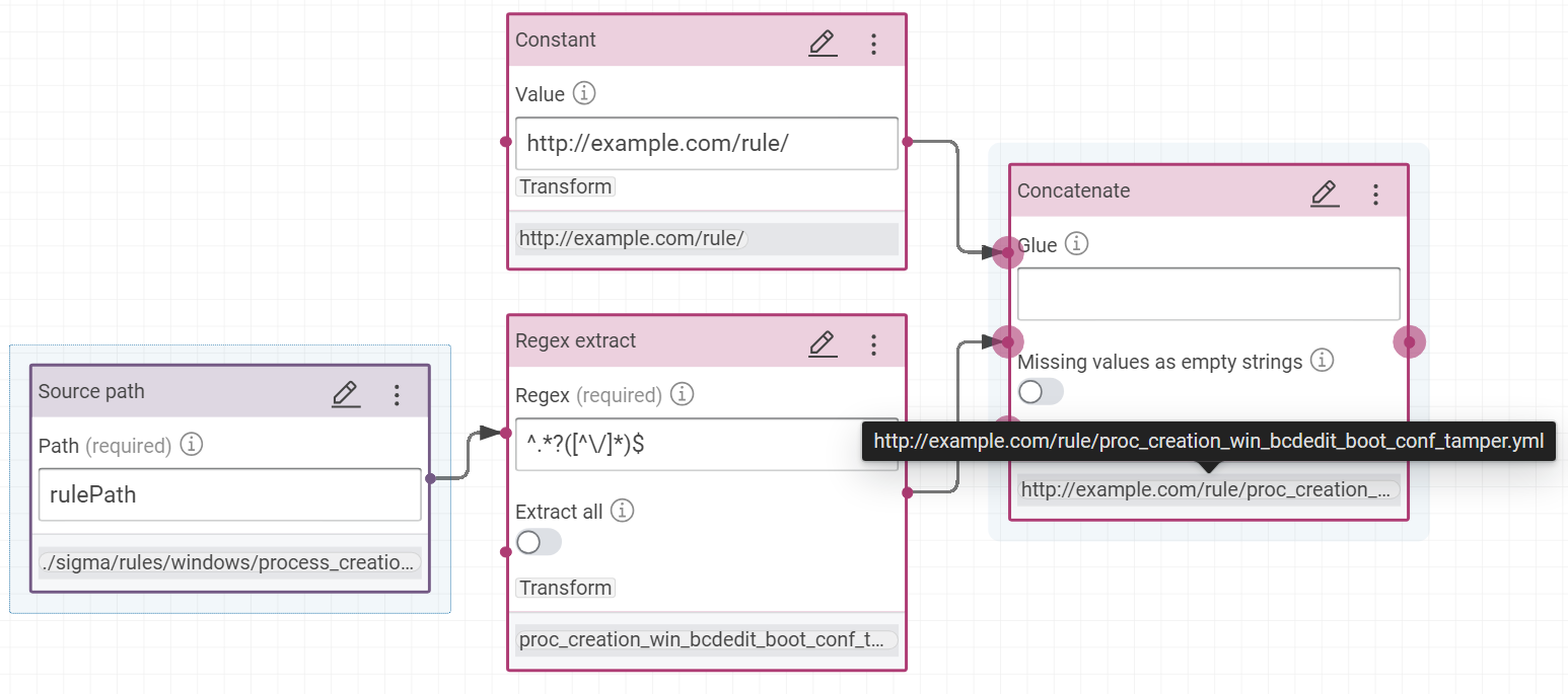 rdfs:isDefinedByon the value pathrulePathis building with this formula to link the rules to their Web addresses.- Add two “Regex replace”