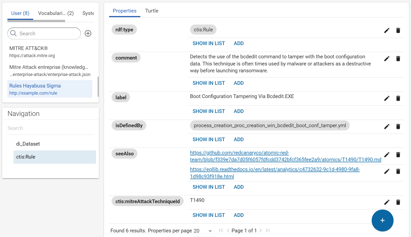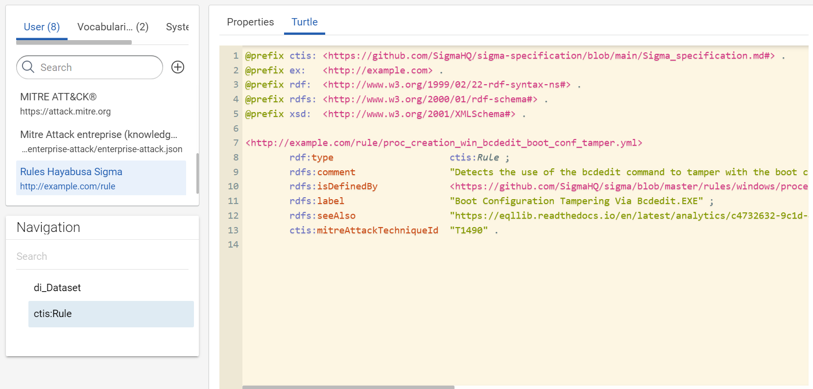 The collected rules are from Sigma and Hayabusa repositories. Hayabusa “are trying to make this rules as close to sigma rules as possible”. In your use case, we need properties defined by Sigma and which also exist in Hayabusa rules. The day where there will be a official RDF vocabulary to define a rule, we will use it. Waiting, your minimal vocabulary is “defined” here: https://github.com/SigmaHQ/sigma-specification/blob/main/specification/sigma-rules-specification.md. We use this address for the prefix of your RDF vocabulary for your use case.