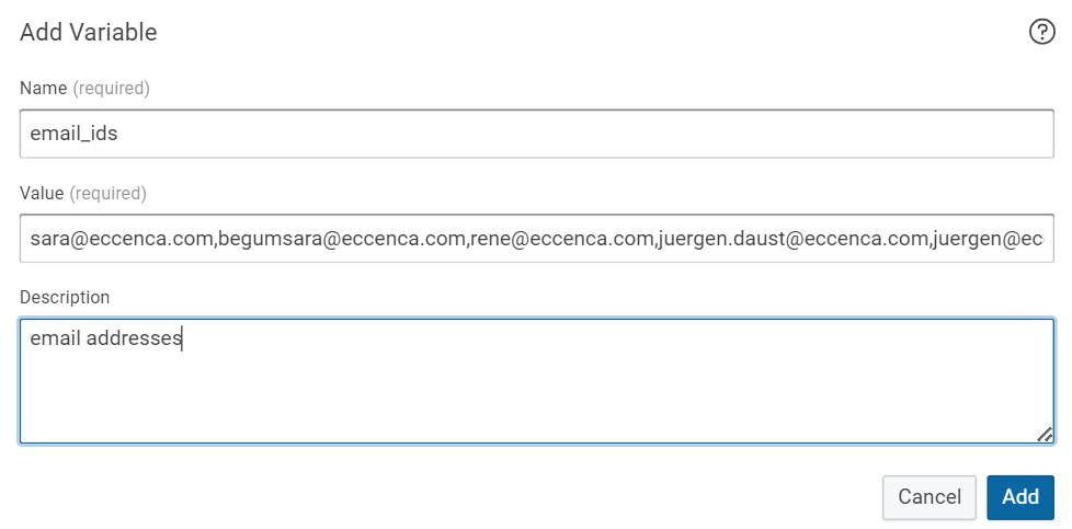 Type name as email_ids, in values we have updated all the email id’s of the team member’s and in description we have updated as email address then click on Add.