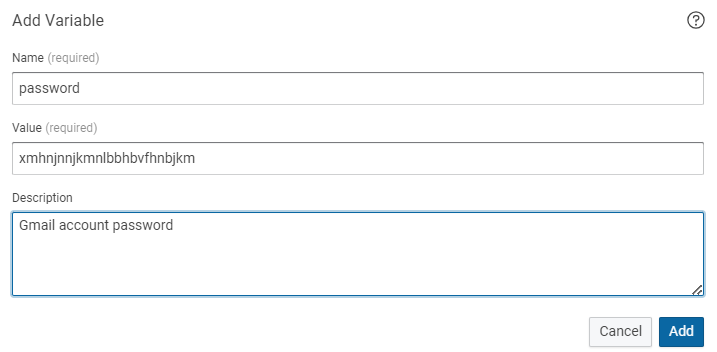 Same as above, add the variable click on and type name as password, value as xmhnjnnjkmnlbbhbvfhnbjkm and in the description Gmail account password as shown below then click on Add.