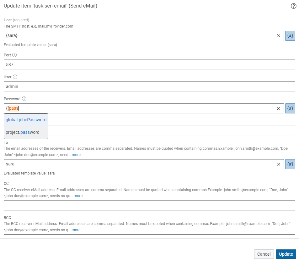 Click on the symbol {#} it turns blue in color. It means the variable’s feature is active then click in the Password option and type {{password}} select the option as shown below and click on Update.