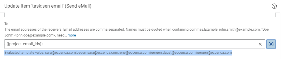 Click on the symbol {#} it turns blue in colour it means the variables feature is active then click in the To option and type {{email_ids}}.