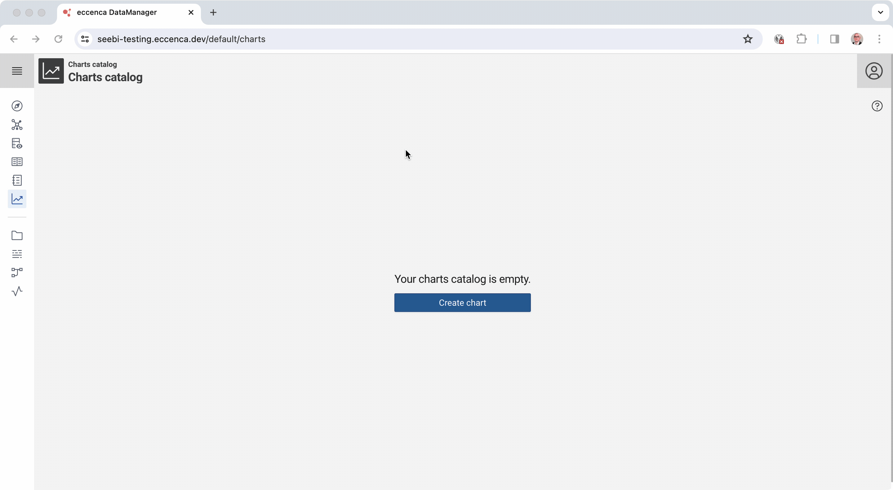 You can open the Charts Catalog from the main menu on the left. You will see a list of existing charts or the information Your charts catalog is empty. Here you can create a new chart or edit an existing one.