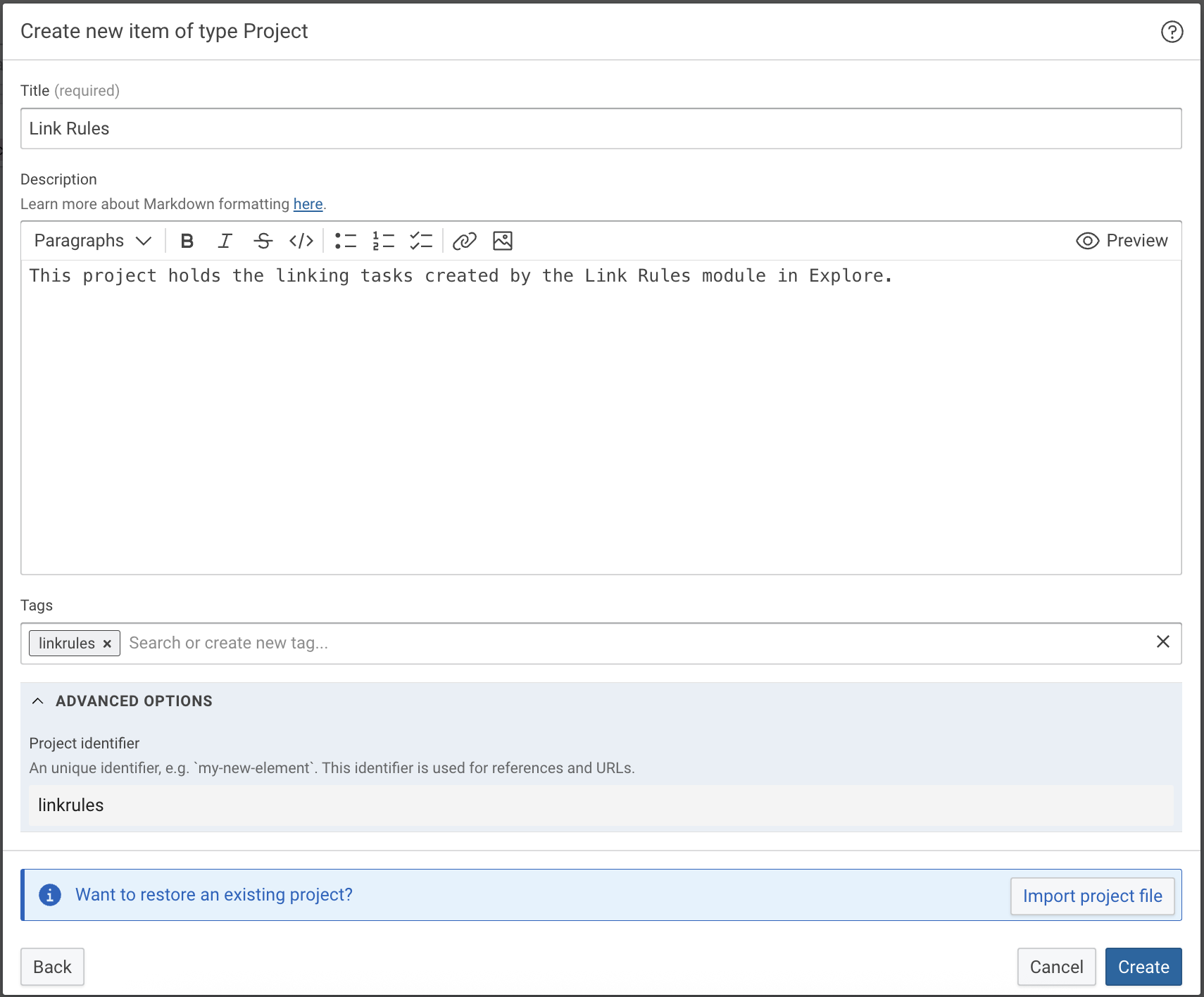 Create a new project in Build that holds all linking tasks created in the Link Rules module.